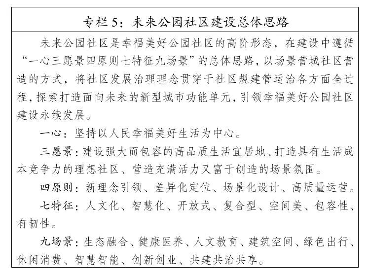 (四)坚持规划引领。按照新理念引领、差异化定位、场景化设计、高质量运营的原则,结合居民实际需求和未来发展趋势,加快编制未来公园社区规划导则,配套制定符合功能定位和社区发展需要的建设技术规范和城市设计方案。完善片区国土空间专项规划和详细规划,立足未来公园社区空间布局、人口分布、生态资源、生产要素等,引导人口、产业、公服配套等合理配置,塑造功能布局均衡、产业特色鲜明、空间尺度宜人、人城境业和谐的新型城市功能单元。